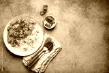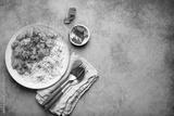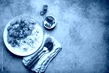 Traditional Indian dish chicken curry with basmati rice and fresh cilantro on rustic white plate on gray concrete table background from above. Indian dinner meal