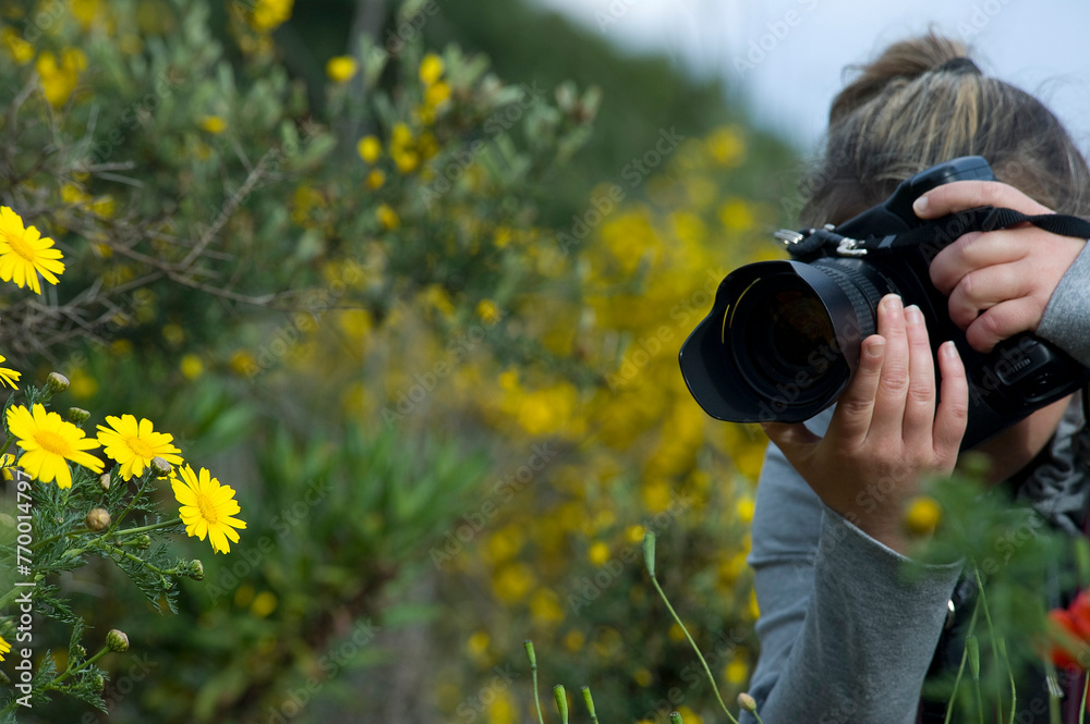 woman taking photo with camera in field, Alghero, Sardinia, Italy