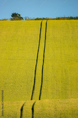Straight tractor tracks lead across a golden wheat field on a rolling landscape