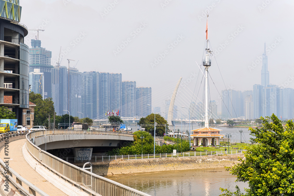 A bridge over the Saigon river in Ho Chi Minh City (Saigon), Vietnam, with the Thu Thiem 2 Bridge (Cầu Ba Son) and Landmark 81 in the background