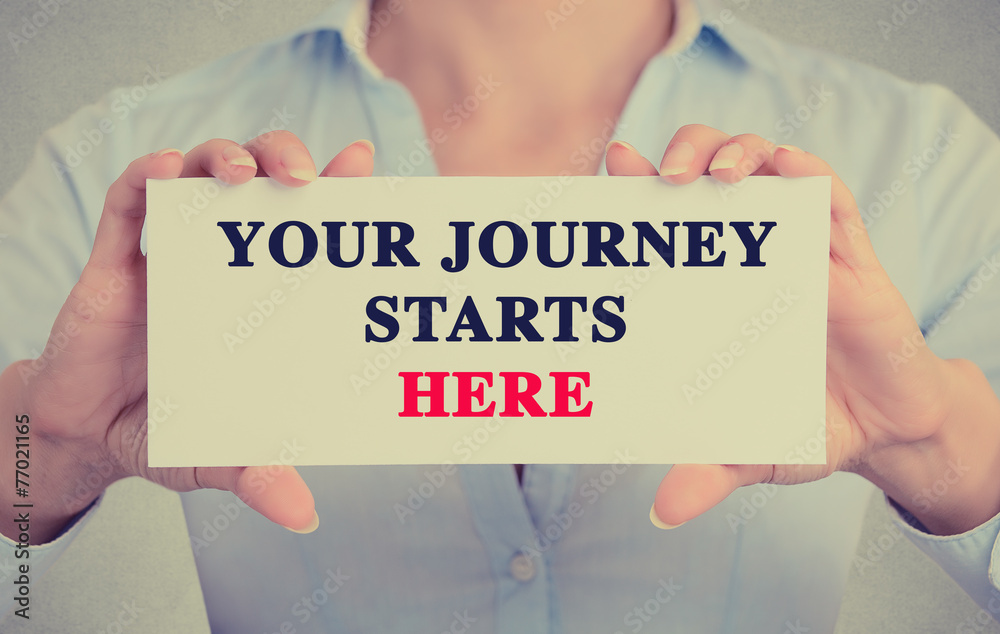 businesswoman hands holding card sign Your Journey Starts Here