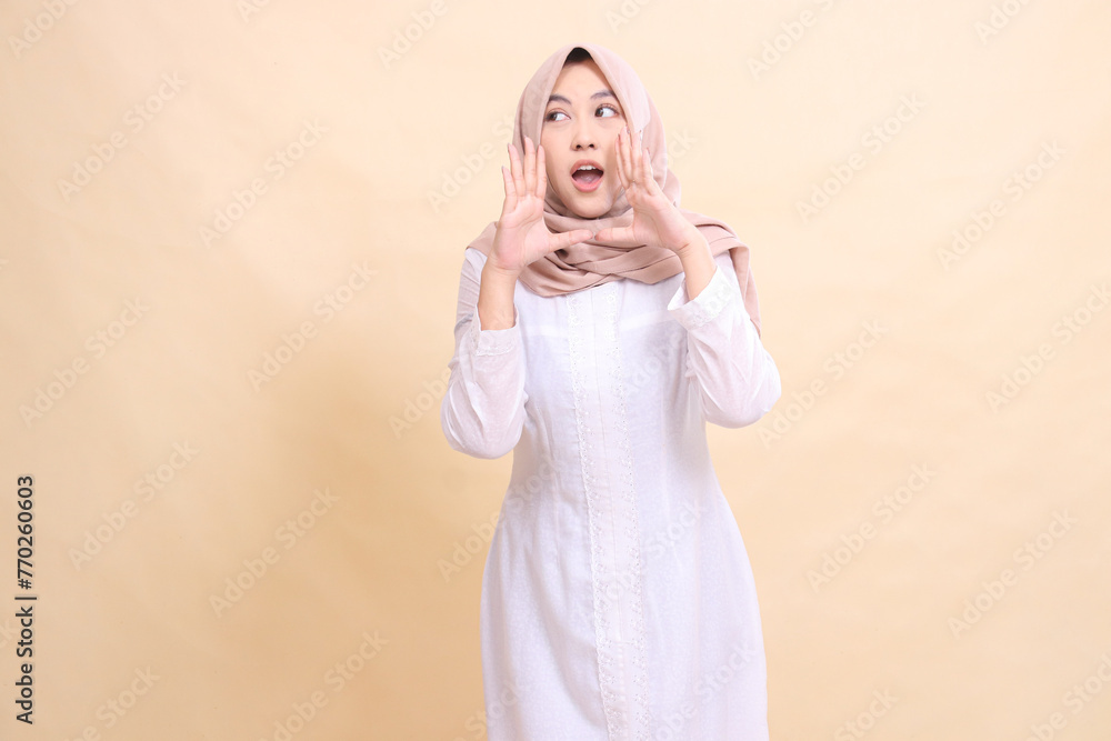 young Asian Muslim woman standing to the candid camera with both hands near her mouth shouting making an announcement. Fashion, pointer, business and promotion concept