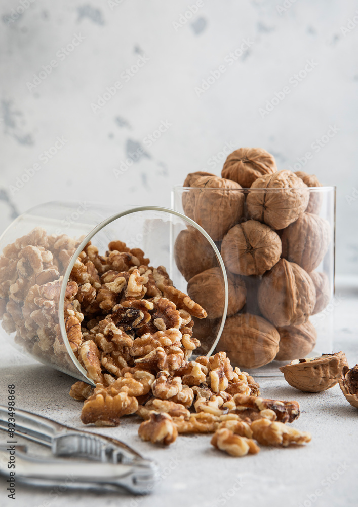 Lamp with the light bulb inside shining on the wall background in the dark room with copy space.