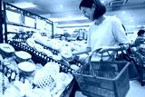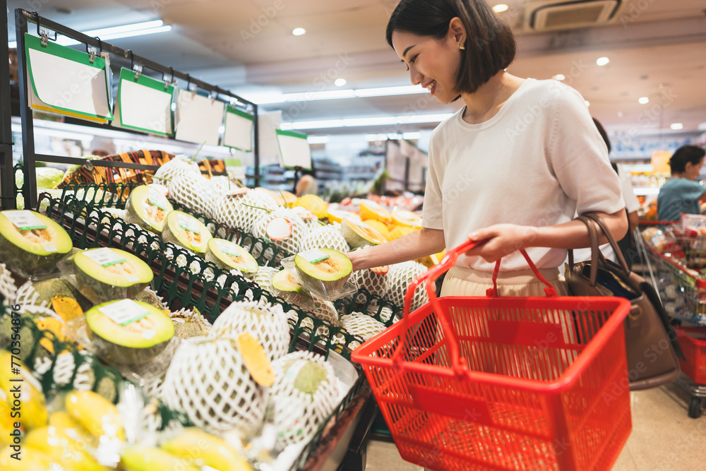 Asian woman consumer choosing organic vegetable product at supermarket store