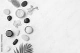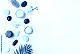 Tropical spa concept with palm leaves, flower heads and zen like stones, top view copy space