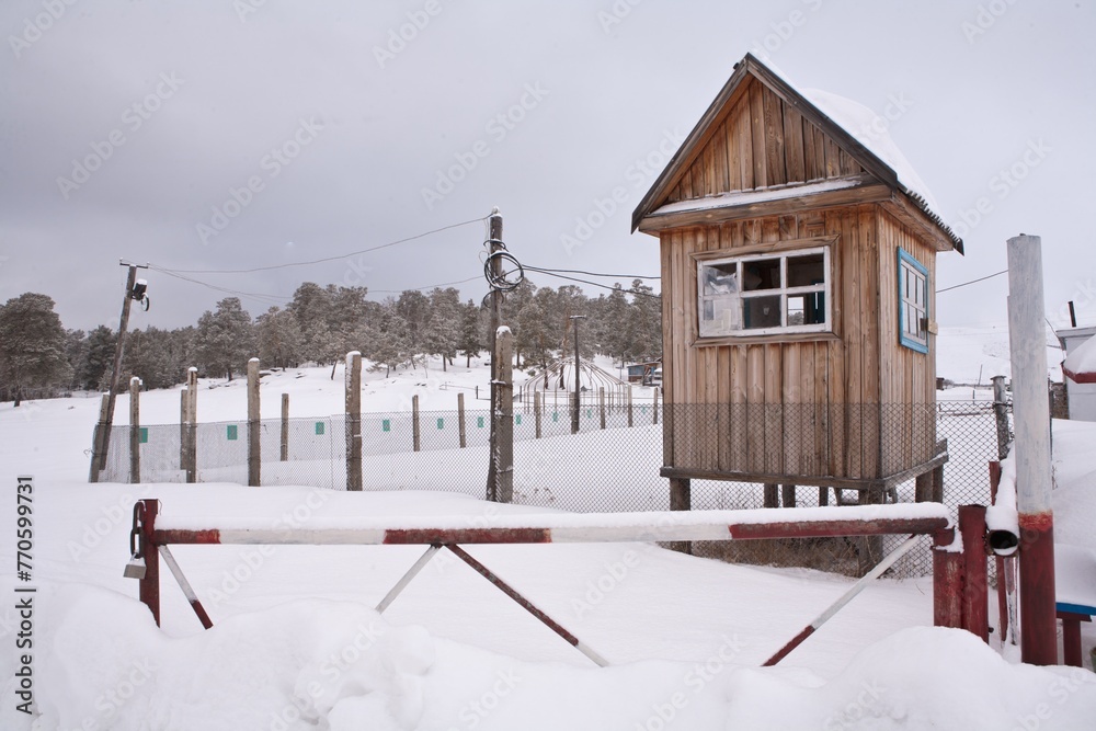 A small, cozy wooden house in nature in the winter park