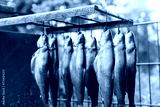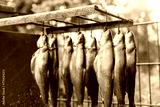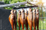 Fresh smoked rainbow trout fish hanging outdoors near smokehouse metal box. Traditional natural smoking process on wooden firewood chips. Homemade handmade hot smoke salmon