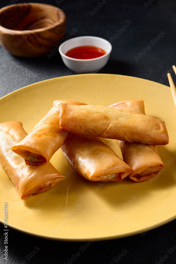 Fried Asian spring rolls on a yellow plate with chopsticks, classic appetizer
