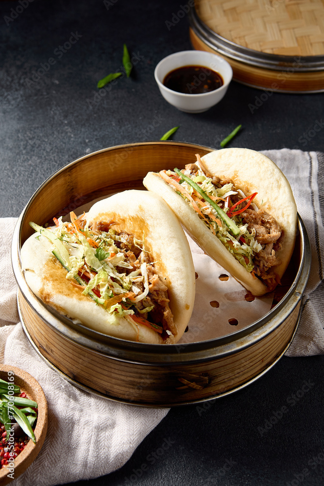 Savory Bao buns stuffed with pulled pork and fresh vegetables, captured from above on a dark background
