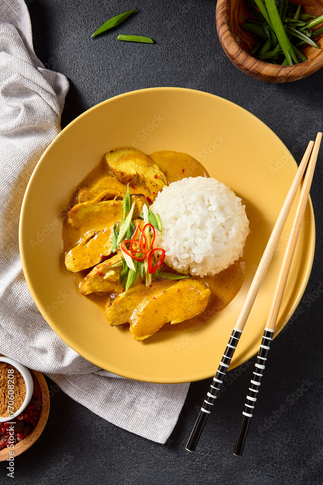 Curry chicken and rice served in a modern ceramic bowl, top view on a textured black background
