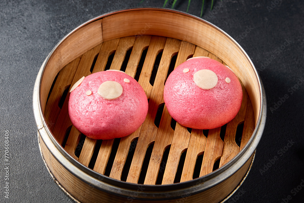 Pink bao buns shaped like pigs in a bamboo steamer; a playful and appetizing Asian culinary creation