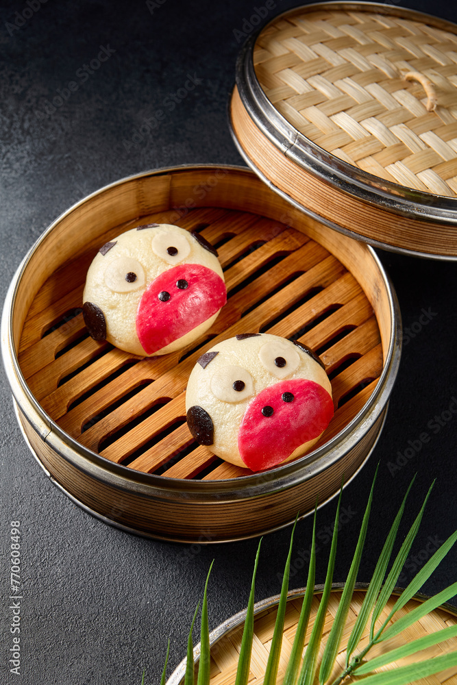 Cow-shaped bao buns in a traditional bamboo steamer; a whimsical twist on a classic Asian snack
