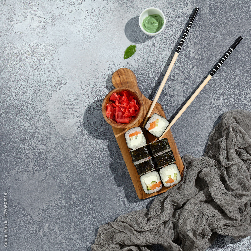 Salmon maki sushi rolls with cucumber and cream cheese, ready for a delightful dining experience