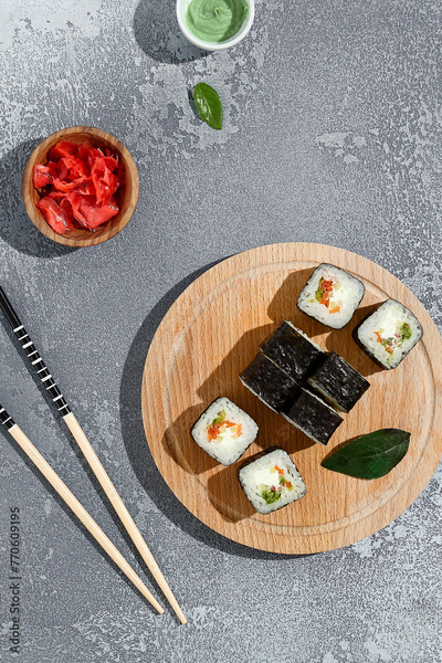 Artistic top view of vegetarian sushi rolls with a side of pickled ginger and wasabi, ideal for a culinary blog