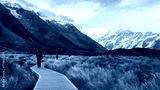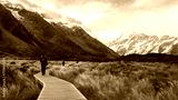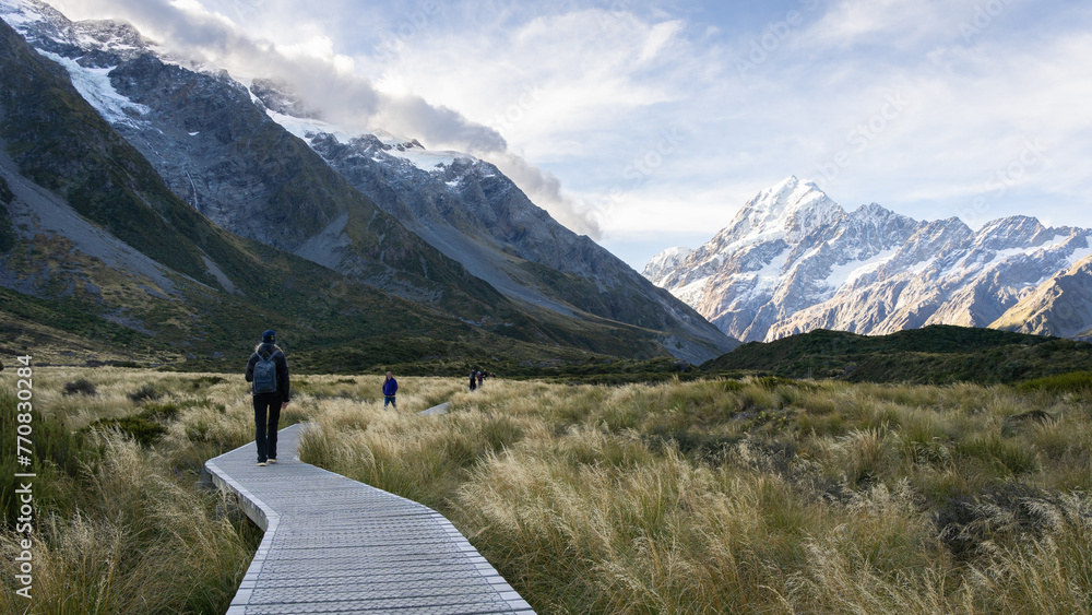 Tourists walking on wooden boardwalk leading through beautiful alpine valley, Mt Cook, New Zealand