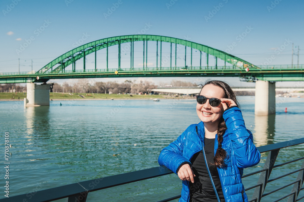 Beautiful happy woman with sunglasses against bridge in Belgrade, Serbia