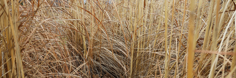 In the wintry countryside, dry grasses and frosted foliage create a textured, cold landscape.