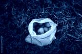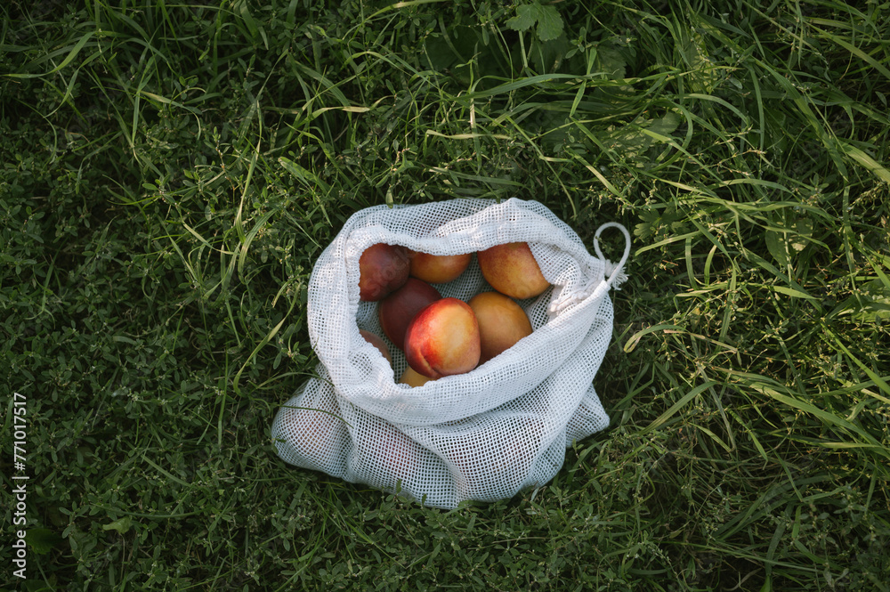 Reusable mesh bag with nectarines and peaches on green grass, zero waste grocery concept,