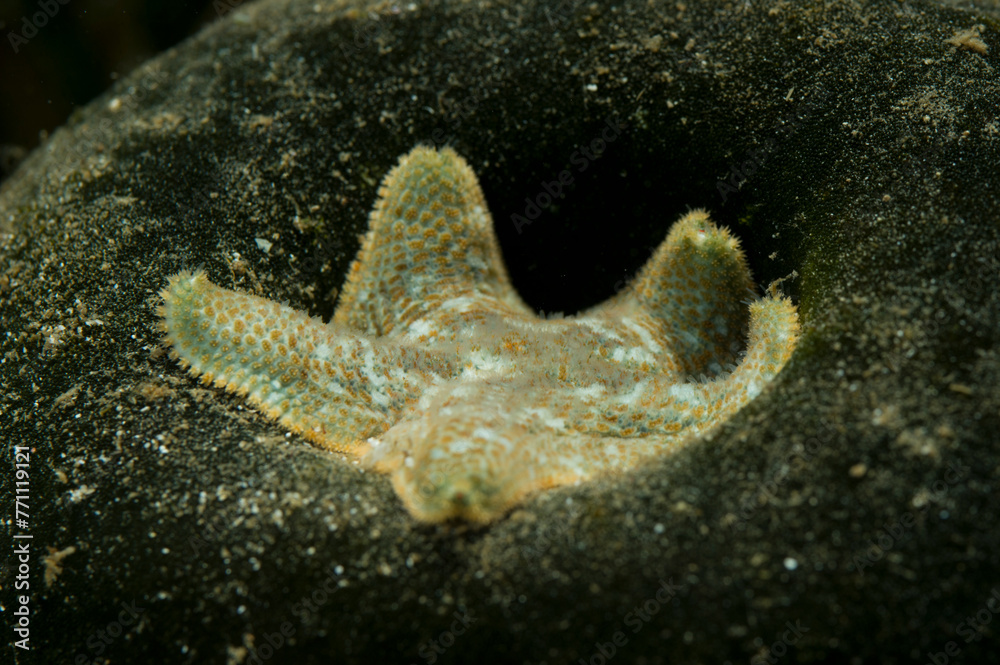 Starlet cushion star (Asterina gibbosa) adult, in rock pool at low tide, Capo Caccia, Alghero, Sardinia, Italy.