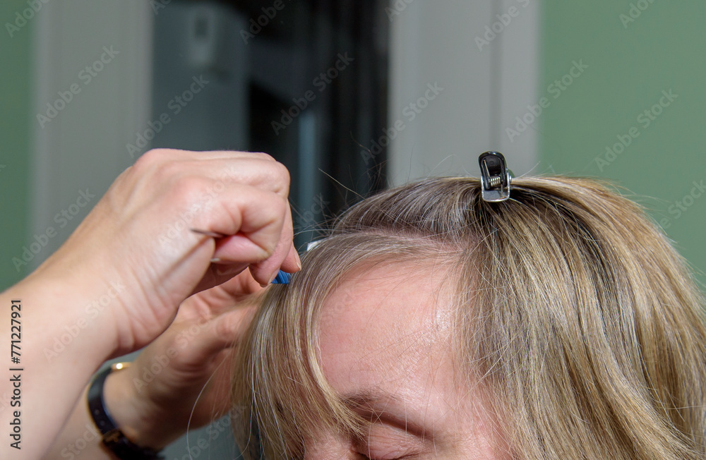 Fixing the hair on the head during the dyeing process. use of foil. selected focus.