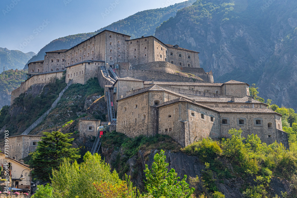 Panorama of the Forte di Bard and the Dora Baltea river, in the background the Alps.