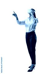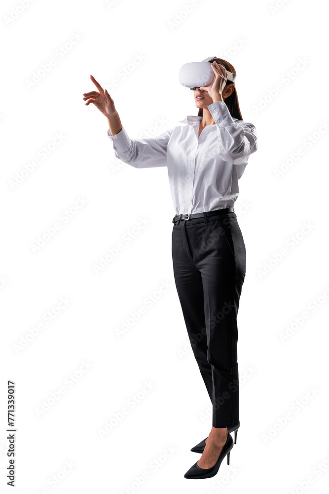 A woman in business attire using virtual reality headset, positioned against a white background, displaying technology use