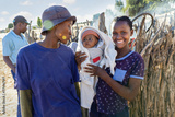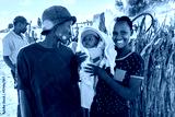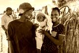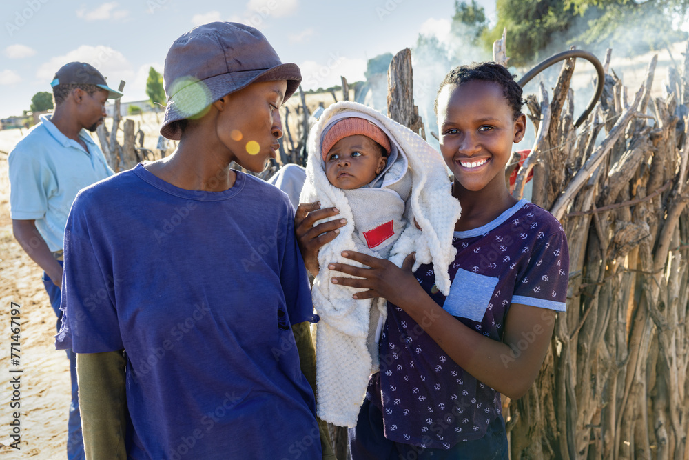 african family with one baby in the village in front of the outdoors kitchen smoke in the background