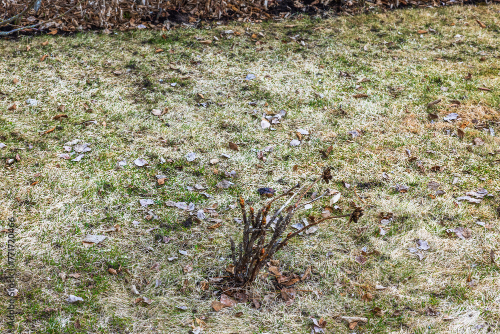 Close-up view of a tree peony bush on the yellow spring lawn in the villa garden after winter. Sweden.