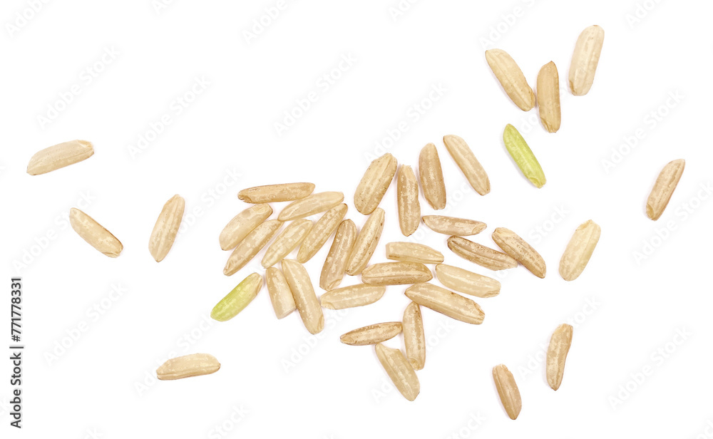 Fresh long brown rice, uncooked and hulled, isolated on white, top view