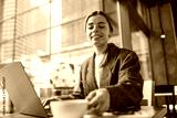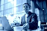 Smiling business woman is drinking coffee in coworking while working on laptop near window