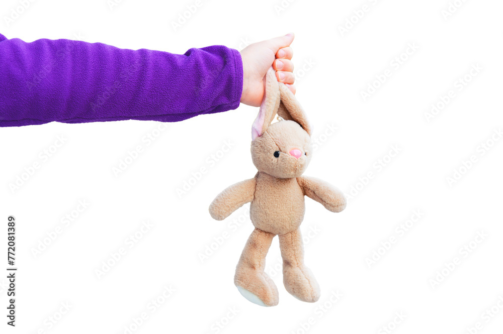 A child holds a small gray toy rabbit by the ears on a transparent and white background. PNG.