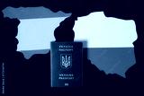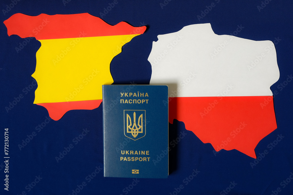 Ukrainian passport. Poland map. Spain map. Blue background of European Union Flag. Ukraine population migration. War. Threat of life.