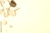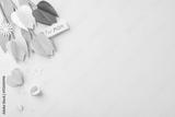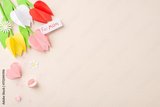 DIY greeting for Mom: Top view of bouquet of handcrafted paper tulips and chamomiles with attached "for mom" note, alongside love hearts on a gentle cream canvas, leaving space for personalized text