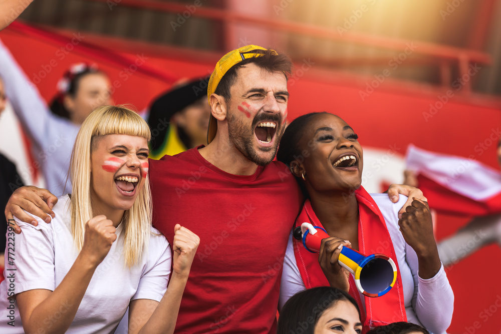 Football / soccer fans are cheering for their team at the stadium on the match