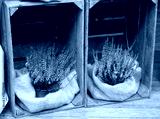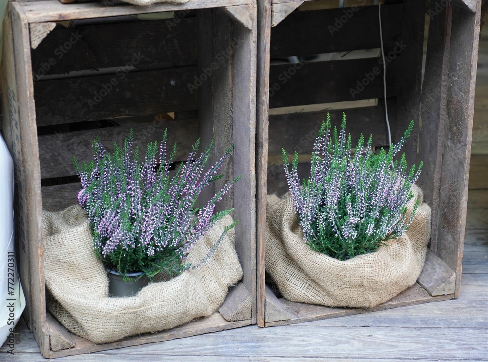 Attractive wooden crate filled with fragrant lavender plants sits on the porch of a home