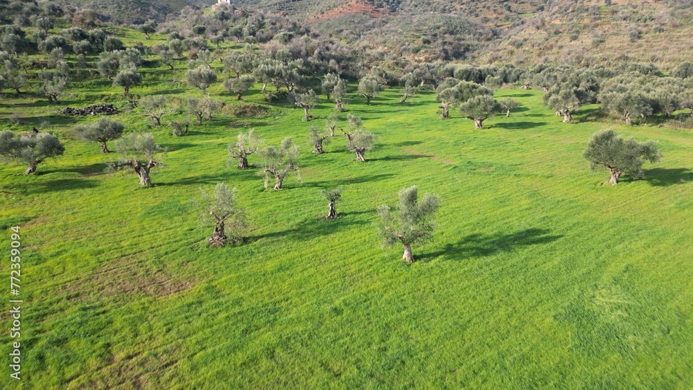 Drone aerial view of the beauty of olive trees for the production of oil olives in Pelopponese, Greece Mani Lakonia - lush lawns and centuries-old olive trees on the Mediterranean coast of Greece