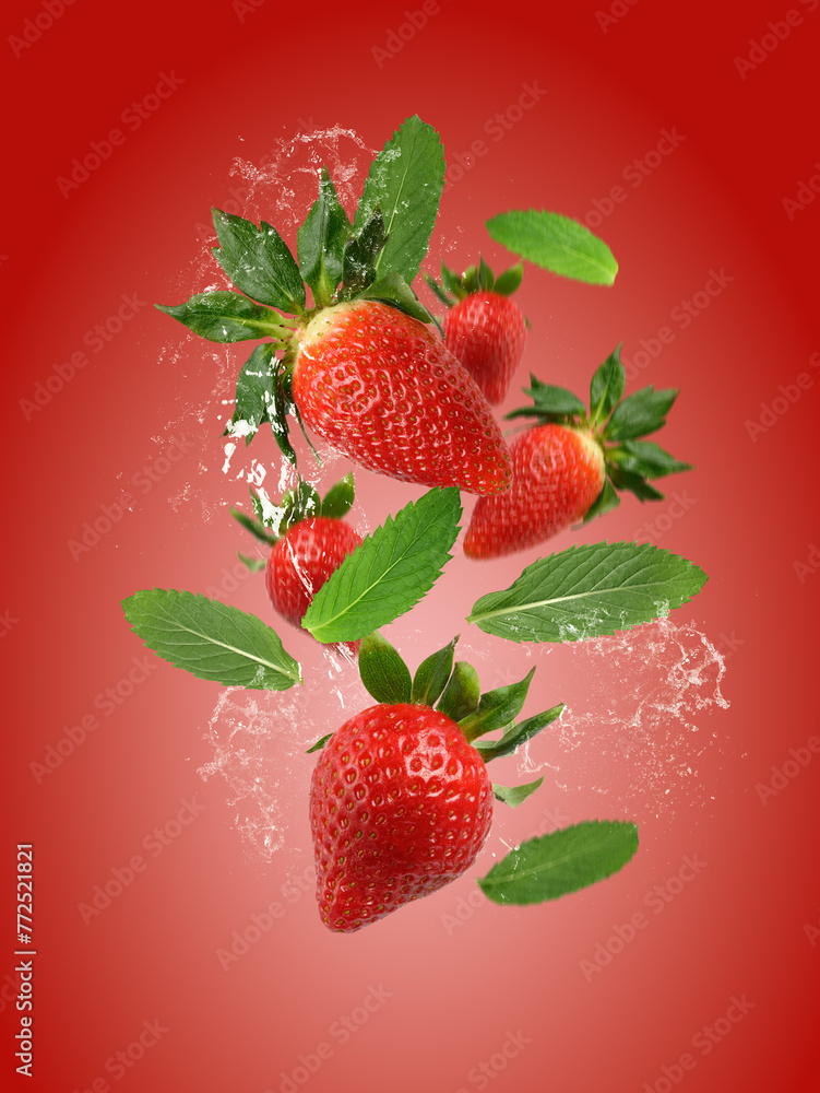 Red ripe strawberry on ia red background. Berries and mint leaves levitate