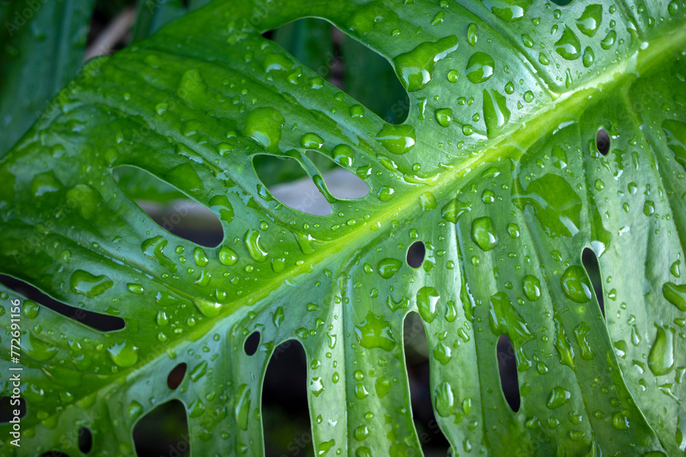 Green Swiss Cheese Plant leaf (Monstera adansonii) with water splash, known as Tarovine