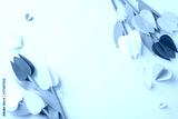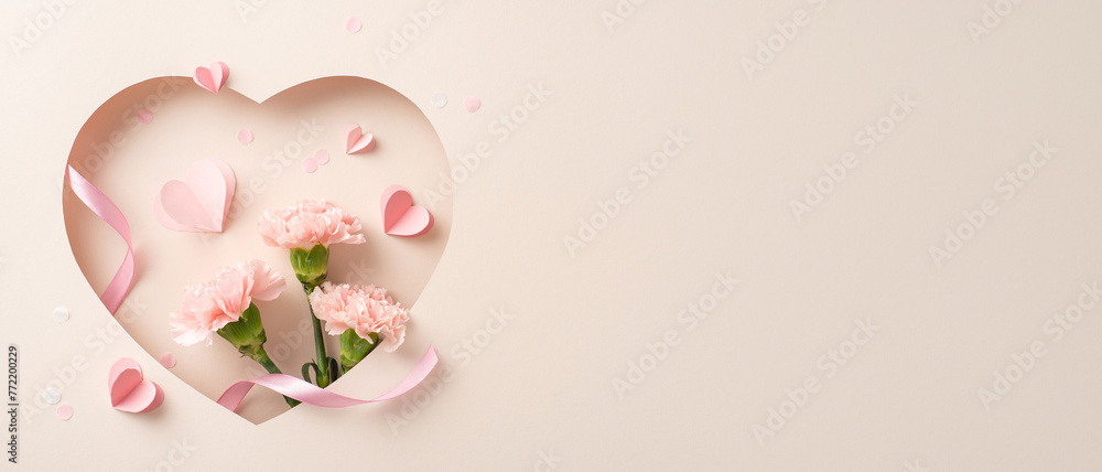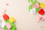 Special Mother's Day creation: Top-view photo of meticulously folded paper tulips, chamomiles, sprinkled with heart confetti on a pastel beige base, with a spot for personalized text