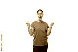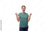 pretty friendly young caucasian brunette woman in green t-shirt rejoices and shouts
