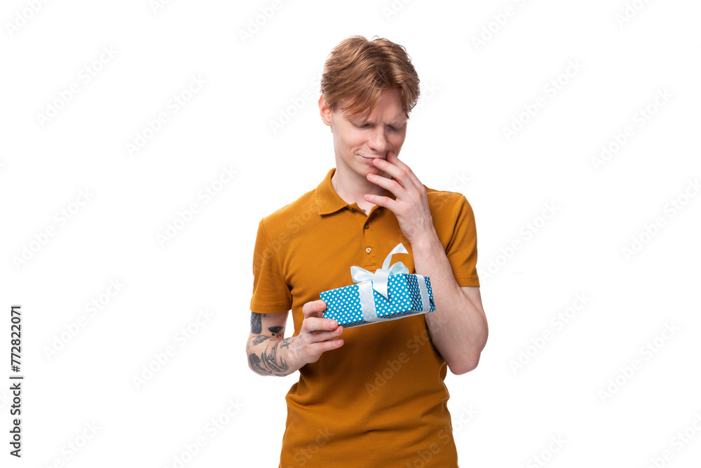 young red-haired guy in an orange t-shirt holding a gift box on a white background with copy space