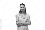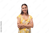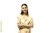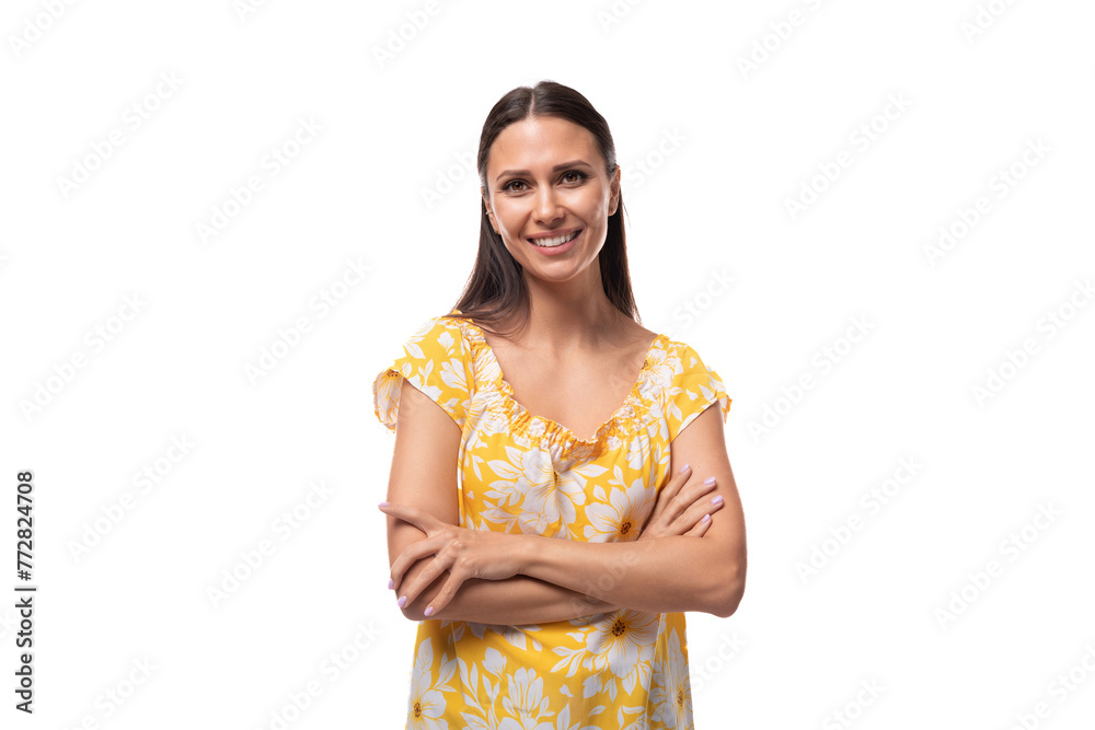 30 year old brunette woman dressed in a summer outfit looks confidently at the camera