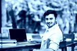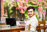 Indian handsome student or businessman using laptop computer outdoors while sitting on table