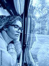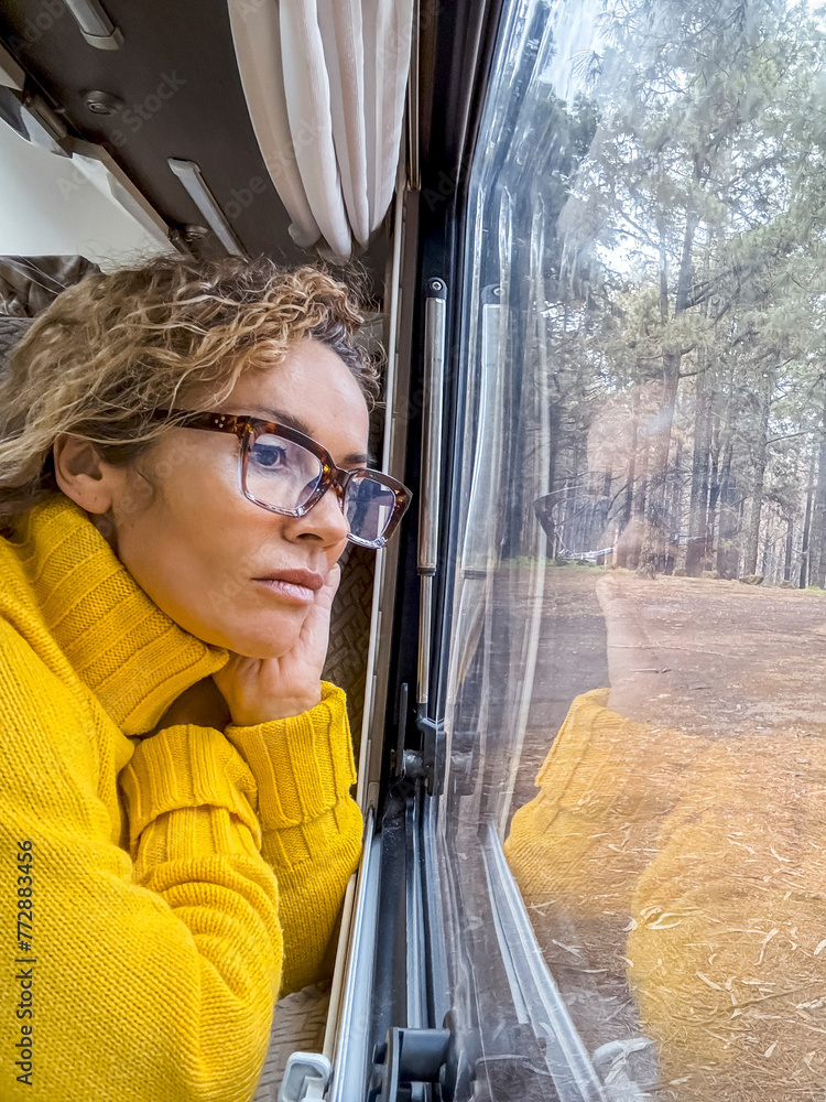 Woman with eyeglasses and yellow sweater relaxes on her looking out the window. the lady enjoys the break in the middle of the forest sitting in her camper