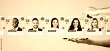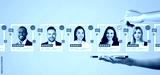 Businesswoman finger touch virtual screen with employees using smartphone