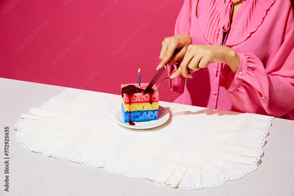 Cropped image of woman in pink shirt sitting at table and cutting birthday cake made of dishwashing sponges and candle. Birthday party. Concept of food pop art photography, creativity, quirky style