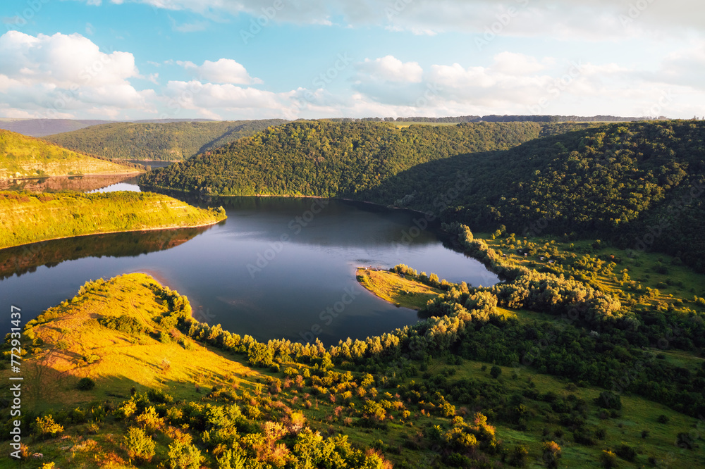 A peaceful view from above of the winding Dniester river. Ukraine, Europe.
