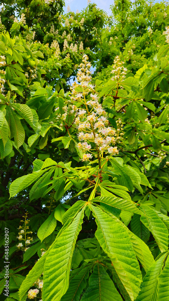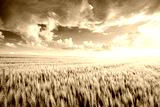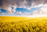 Gorgeous ripe ears of wheat in a field with fluffy snow-white clouds.