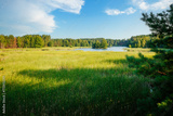 A magical view of a quiet lake surrounded by coniferous forest on a sunny day.