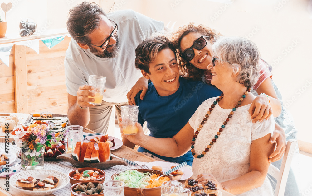 Beautiful happy multigenerational family having lunch together on the terrace at home. Parents, son and grandmother smile enjoying closeness and free time